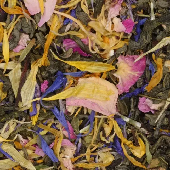 groene jasmijnthee*, groene thee*, zwarte thee*, stevia*, rozen-*, goudsbloem-* en korenbloem-bloesem*
