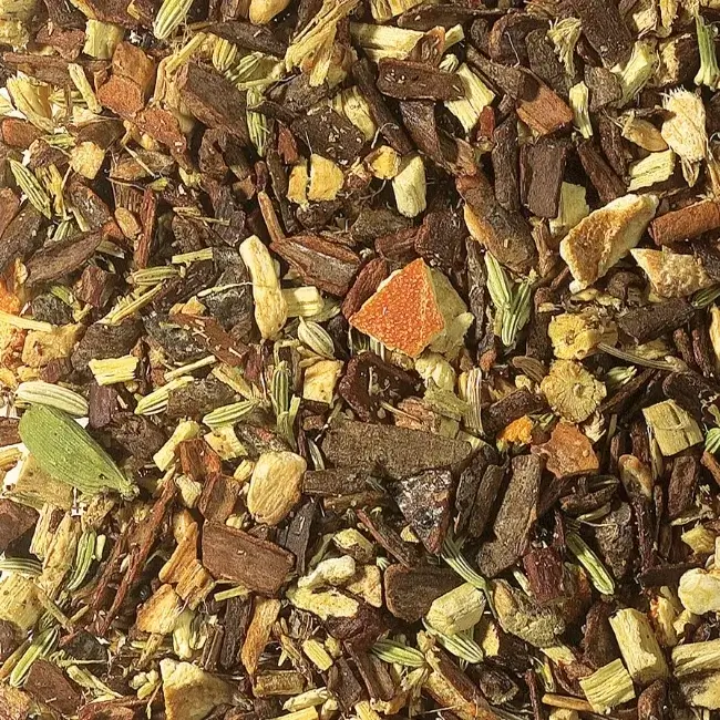 kaneelstukjes, zoethoutwortel, gemberstukjes, venkel, sinaasappelschil, kardemom (heel).